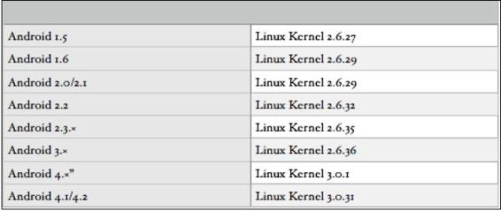 早期版本的 Android(<4.0)基于 Linux 内核 2.6.x,而较新版本基于内核 3.x. 不同的 Android 版本和他们使用的 Linux 内核的列表规定如下: