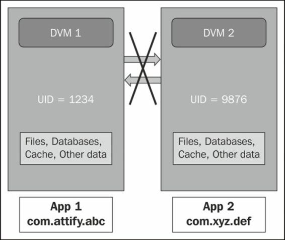如前图所示和前面所讨论的,Android 中的每个应用程序都在其自己的 Dalvik 虚拟机实例中运行。 这就是为什么,无论何时任何应用程序在我们的设备中崩溃,它只是显示强制关闭或等待选项,但其他应用程序继续顺利运行。 此外,由于每个应用程序都在其自己的实例中运行,因此除非内容提供者另有规定,否则将无法访问其他应用程序的数据。