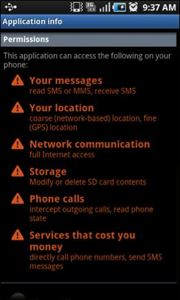 此权限屏幕显示应用程序可以通过手机执行的所有任务的列表,例如发送短信,访问互联网和访问摄像头。 请求多于所需的权限使应用程序成为恶意软件作者的更具吸引力的目标。
