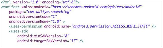 一个正常的AndroidManifest.xml文件看起来像下面的截图所示。 在这里,你可以使用<uses-permission>标记和其他标记查看所需的不同权限: