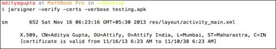 如果我们有一个 Android 应用程序(.apk)文件,我们可以检查应用程序的签名,并找到使用称为jarsigner的工具签署应用程序的人,这个工具是 Android SDK 自带的: