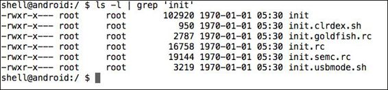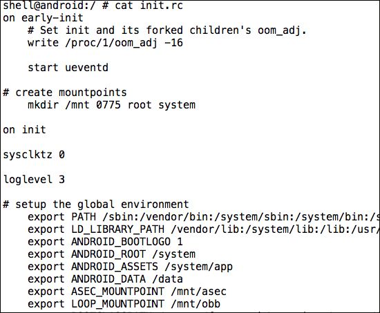 如果我们对init.rc文件执行cat,我们可以看到init加载自身时使用的所有规范,如下面的截图所示: