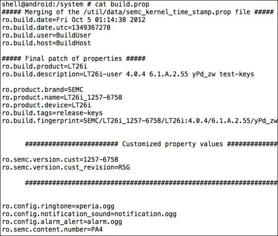 加载时使用的一些属性位于build.prop,它位于location/system。 当你在 Android 设备上看到 Android logo 时,就完成了init进程的加载。 正如我们在下面的截图中可以看到的,我们通过检查build.prop文件来获取设备的具体信息: